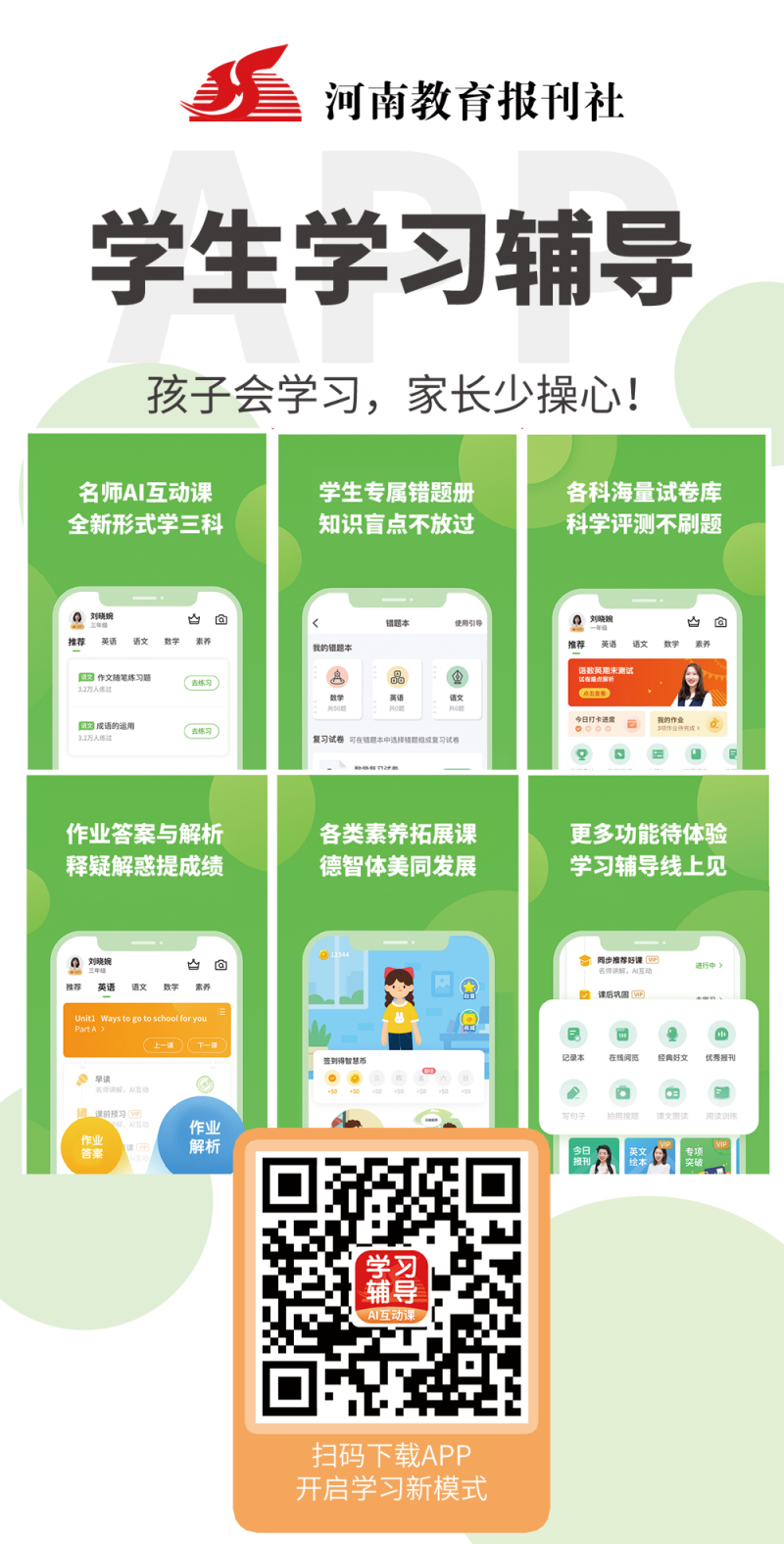 “學生學習輔導”是河南教育報刊社新打造的一款數(shù)字媒體產(chǎn)品。以線上資源平臺(APP)形式呈現(xiàn)小學一至六年級、初中七至九年級課內(nèi)同步及課外配套學習資源。包括萬余節(jié)名師同步AI互動課,各版本教材重難點知識講解,點讀、聽寫、錯題本等學習工具,勞動與社會實踐、體音美素養(yǎng)、科學常識拓展課程等。各年級各科內(nèi)容和功能對訂戶全部開放?!皩W生學習輔導”已列入河南省教育廳圖工委辦公室、河南教育新聞中心、中國郵政集團有限公司河南省報刊發(fā)行局聯(lián)合推薦目錄(郵發(fā)代號36-1017),可通過郵局直接訂閱。