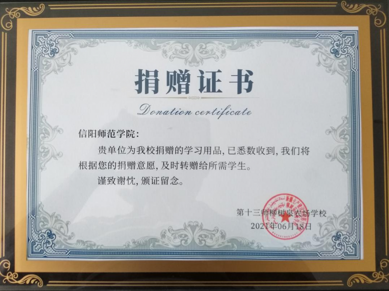 第十三師柳樹泉農(nóng)場(chǎng)學(xué)校給信陽師范學(xué)院的捐贈(zèng)證書