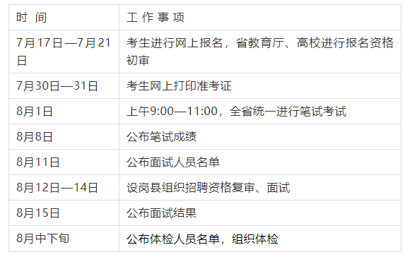 3.組織面試。各地組織面試時間為8月12日—14日。面試主要考察應(yīng)聘者學(xué)科知識、教師基本素養(yǎng)、語言表達(dá)能力、儀表舉止等,滿分為100分。面試工作由各設(shè)崗縣(市)或省轄市組織實(shí)施。