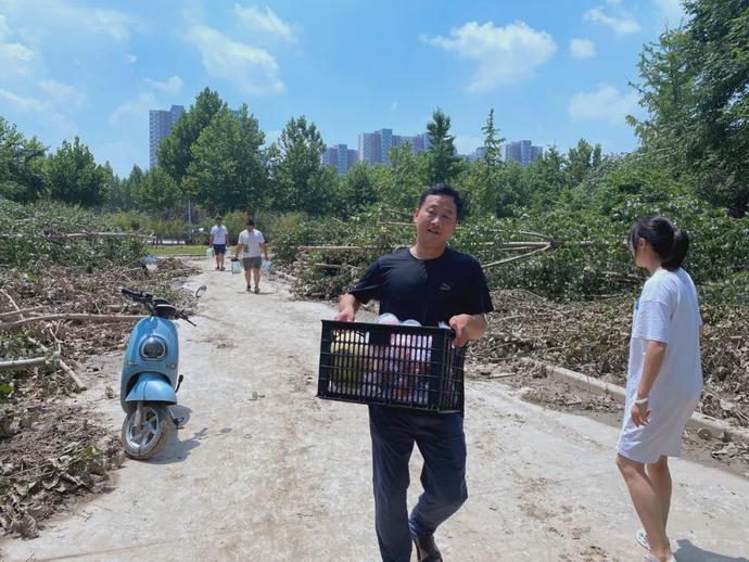 走進(jìn)第五十四中學(xué),學(xué)校正在進(jìn)行地下室的排水作業(yè),眾意路小學(xué)黨員志愿者們搬卸援助物資時(shí),偶遇了熱心幫助的群眾。54中校長(zhǎng)周維華表示,眾意路小學(xué)溫暖的援助加固了54中防汛一線的“堅(jiān)固堤壩”。