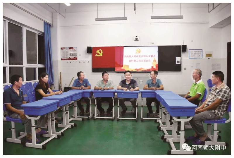 為在防汛救災(zāi)群眾轉(zhuǎn)移安置工作中進一步發(fā)揮黨支部戰(zhàn)斗堡壘作用和黨員的先鋒模范作用,7月30日晚上,河南師范大學(xué)附屬中學(xué)安置點臨時第一、第二黨支部成立。