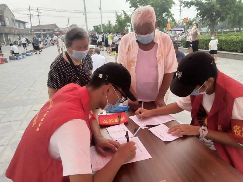 這支志愿者隊(duì)伍是由淮陽中學(xué)劉華東老師組建的。劉華東看到疫情檢測(cè)工作人員人手不夠的實(shí)際情況,就積極動(dòng)員組織返鄉(xiāng)回來的大學(xué)生,參與到志愿者隊(duì)伍中來。這支隊(duì)伍是7月底才組織,8月1日就正式開始服務(wù),短短十幾天,志愿者隊(duì)伍從幾人擴(kuò)大到幾十人。