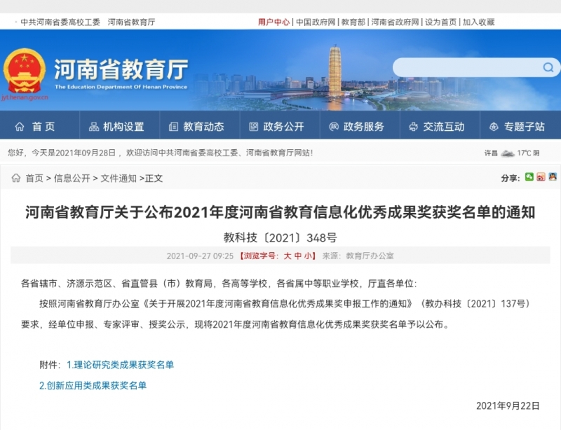 按照河南省教育廳辦公室《關(guān)于開展2021年度河南省教育信息化優(yōu)秀成果獎申報(bào)工作的通知》要求,經(jīng)單位申報(bào)、專家評審、授獎公示,9月27日,河南省教育廳公布2021年度河南省教育信息化優(yōu)秀成果獎獲獎名單,包括理論研究類成果獲獎名單和創(chuàng)新應(yīng)用類成果獲獎名單。河南教育報(bào)刊社開發(fā)的“學(xué)生學(xué)習(xí)輔導(dǎo)”智能教育學(xué)習(xí)平臺被評為區(qū)域類二等獎。