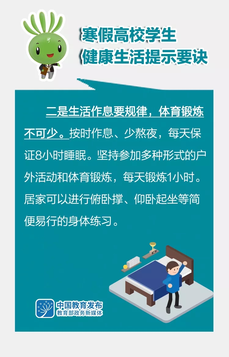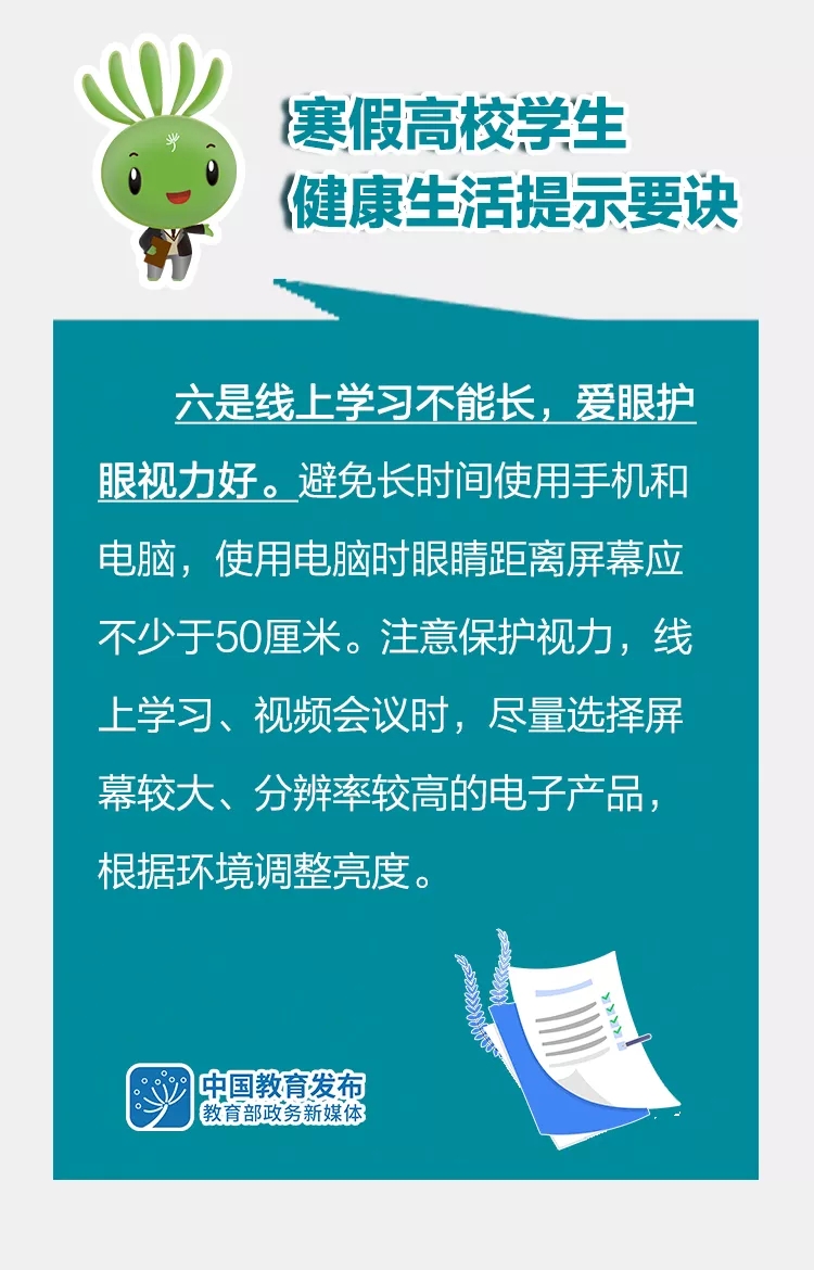 2022年寒假臨近,近日,教育部指導(dǎo)全國高校健康教育教學(xué)指導(dǎo)委員會(huì)專家,提出2022年寒假高校學(xué)生健康生活提示要訣,引導(dǎo)高校學(xué)生增強(qiáng)“健康第一責(zé)任人”意識(shí),合理安排寒假生活和學(xué)習(xí),積極參與疫情防控,養(yǎng)成健康生活方式。一起來看這組大圖——