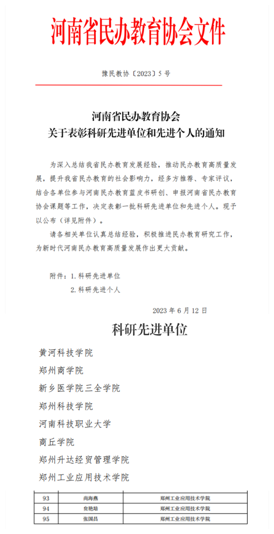近日,從河南省民辦教育協(xié)會(huì)《關(guān)于表彰科研先進(jìn)單位和先進(jìn)個(gè)人的通知》中獲悉,鄭州工業(yè)應(yīng)用技術(shù)學(xué)院被評(píng)為“科研先進(jìn)單位”榮譽(yù)稱號(hào),尚海燕、贠艷培、張國(guó)昌三名教師獲得“科研先進(jìn)個(gè)人”。
