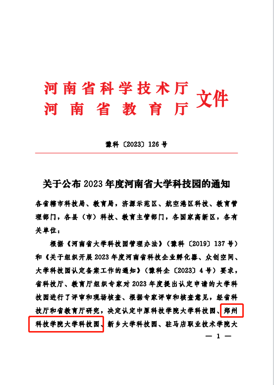 日前,河南省科技廳和河南省教育廳聯(lián)合發(fā)布了《關(guān)于公布2023年度河南省大學(xué)科技園的通知》(豫科[2023]126號(hào)),鄭州科技學(xué)院大學(xué)科技園被認(rèn)定為河南省大學(xué)科技園。