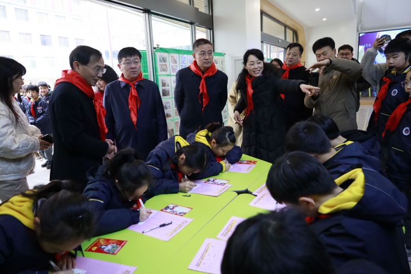 升旗儀式結束后,與會嘉賓走進河南省實驗小學雷鋒少年郵局,在少先隊員代表們的帶領下參觀郵票展,并向新縣列寧小學紅色后代郵寄明信片和文體用品。