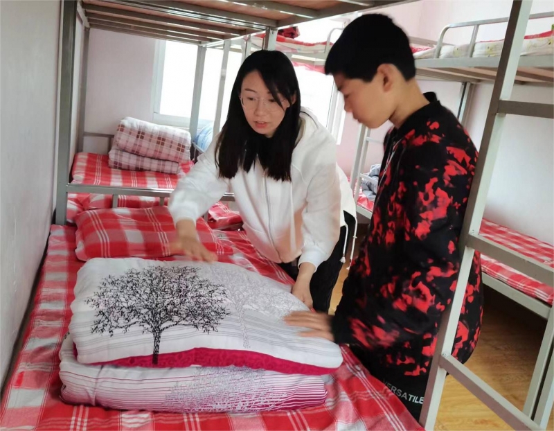 學(xué)生因?yàn)殡x家較遠(yuǎn)基本都需要住校。當(dāng)正常孩子還在媽媽?xiě)牙锶鰦傻臅r(shí)候,這些平均只有八九歲的殘障孩子就要學(xué)會(huì)自己吃飯、疊被、洗漱,適應(yīng)一個(gè)人睡覺(jué)的生活。2017年秋期開(kāi)學(xué),李冰值夜班時(shí)發(fā)現(xiàn)一個(gè)小女孩躲在被窩里哭,問(wèn)過(guò)才知道原來(lái)是第一次離家想媽媽了,于是李冰抱著她,哄到十點(diǎn)多才睡去。10年來(lái),無(wú)數(shù)個(gè)夜晚,李冰每次夜里值班,都要起來(lái)幾次,給蹬掉被子的學(xué)生蓋好被子。