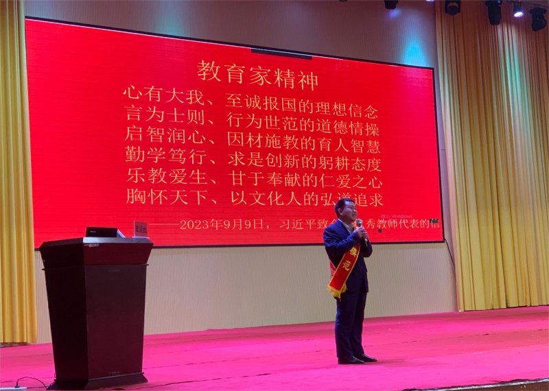 在報告會上, 張玉滾以《弘揚教育家精神,爭做時代“大先生”》為題,結合工作經歷,滿懷深情地講述了自己作為一名共產黨員和人民教師,扎根偏僻山村20余年,愛護學生、專心教學、默默堅守在基層教育一線的經歷和事跡,生動詮釋了育人崇德、師者匠心的深刻內涵。他誓言要和各位教師一起努力提高綜合素質,大力弘揚教育家精神,樹立“躬耕教壇,強國有我”的志向和抱負,用大愛書寫教育人生,為鄉(xiāng)村教育振興貢獻力量。