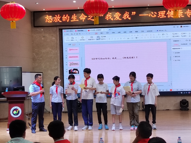 活動(dòng)伊始,樊老師用“目標(biāo)式鼓掌”的暖場小游戲活躍了現(xiàn)場氣氛,拉近了與學(xué)生的距離。接下來,樊老師以“我是誰”、“愛自己是......”、”接納關(guān)系”三個(gè)活動(dòng)引導(dǎo)學(xué)生交流,由淺入深,逐層深入,告訴學(xué)生每個(gè)人都是不同的個(gè)體,都各有優(yōu)點(diǎn);在別人眼中,比自己想象中要好;要有自信心,讓孩子們認(rèn)識(shí)自我、接納自我。整場講座氣氛熱烈,孩子們積極參與,用心思考,認(rèn)真記錄。