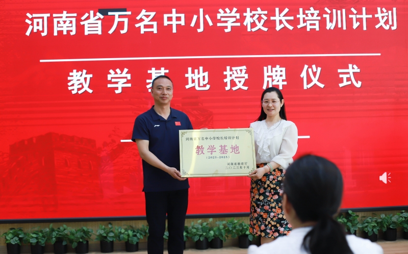 戶外觀摩結(jié)束后,河南省萬名中小學(xué)培訓(xùn)計(jì)劃項(xiàng)目辦公室學(xué)員管理部負(fù)責(zé)人吳雙喜為鄭州市金水區(qū)第一幼兒園教育集團(tuán)授予“河南省萬名中小學(xué)校長(zhǎng)培訓(xùn)計(jì)劃教學(xué)基地”的稱號(hào)。
