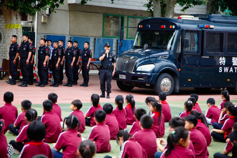 演練結(jié)束后,特警鐵騎為同學(xué)們展示了高超的摩托駕駛技術(shù),轟鳴聲、掌聲、歡呼聲此起彼伏。隨后,經(jīng)八路派出所副所長曾夏南為孩子們普及了預(yù)防電信詐騙的知識(shí)并和特警隊(duì)員們共同與孩子們互動(dòng),讓孩子們近距離接觸、體驗(yàn)特警車輛,送上兒童節(jié)祝福。最后,辦公室高鵬主任對(duì)本次活動(dòng)進(jìn)行總結(jié),要求安保人員與教職工時(shí)刻緊繃“安全弦”,共同為校園安全保駕護(hù)航。