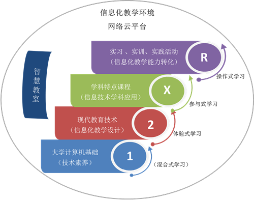 構(gòu)建信息化教學(xué)課程體系。安陽(yáng)師范學(xué)院通過(guò)全面修訂師范類專業(yè)人才培養(yǎng)方案,不斷優(yōu)化課程體系,重構(gòu)課程內(nèi)容,按照 “按需選課、滲透學(xué)科、全程實(shí)踐、雙師指導(dǎo)”的培養(yǎng)策略,形成了“2+X+S”的課程體系。如圖所示: