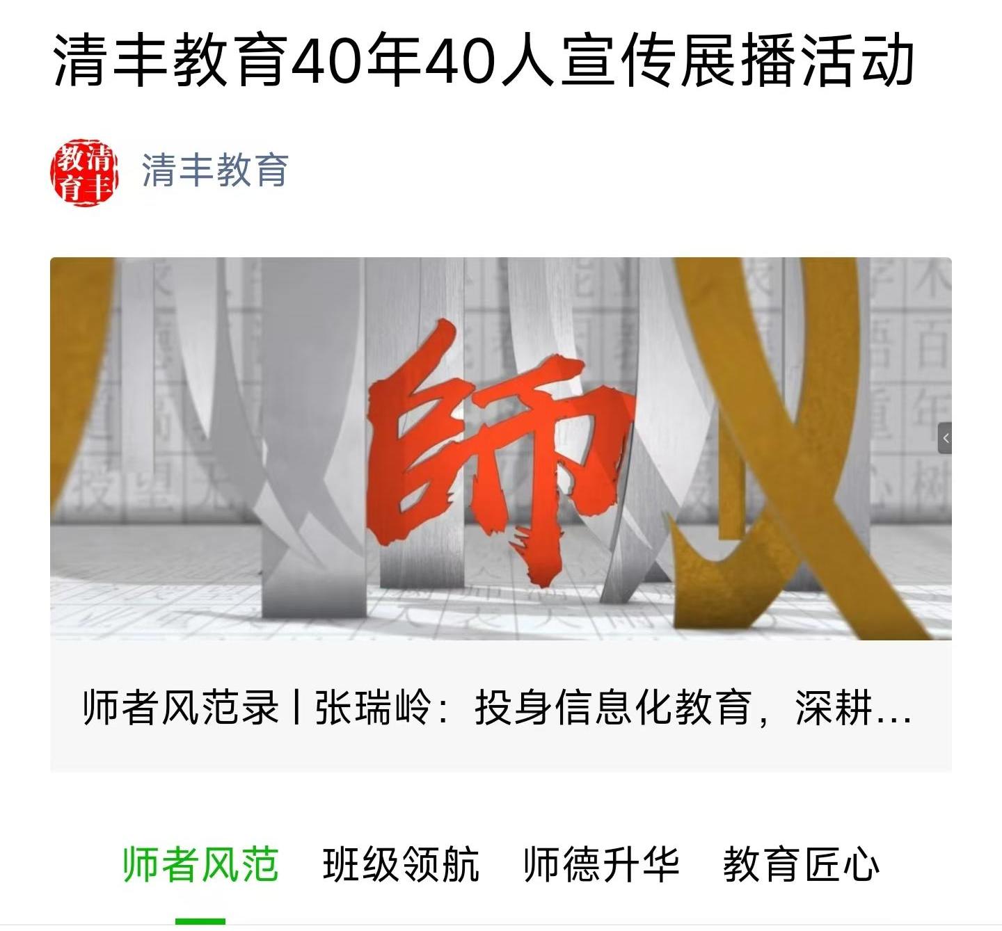 第40個(gè)教師節(jié)來(lái)臨之際,清豐縣特別推出“清豐師表40載”——清豐教育40年40人宣傳展播活動(dòng)?;顒?dòng)共分為4個(gè)專(zhuān)欄,為“師者風(fēng)范錄”“班級(jí)領(lǐng)航者”“師德升華坊”“教育匠心集”四大板塊,分別展播“優(yōu)秀教師”“優(yōu)秀班主任”“師德先進(jìn)個(gè)人”“優(yōu)秀教育工作者”。