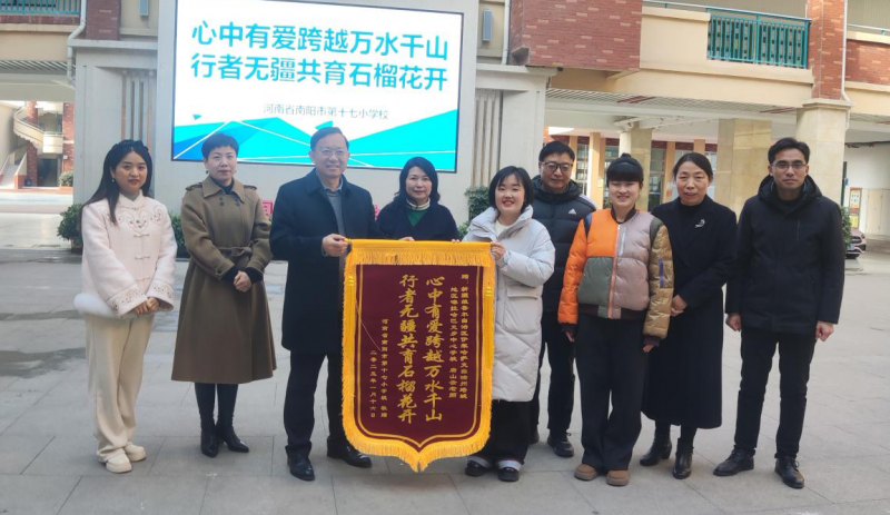 1月18日,在河南省南陽(yáng)市第十七小學(xué)的操場(chǎng)上,一場(chǎng)溫情的告別正在上演。來自新疆塔城市喀拉哈巴克鄉(xiāng)中心學(xué)校的副校長(zhǎng)兼英語(yǔ)老師唐山云,將一面寫有“心中有愛跨越萬(wàn)水千山 行者無疆共育石榴花開”的錦旗送給南陽(yáng)市第十七小學(xué)校長(zhǎng)張哲,與朝夕相處一年的南陽(yáng)市第十七小學(xué)英語(yǔ)教研組組長(zhǎng)陳晨緊緊擁抱,淚眼婆娑,依依不舍。