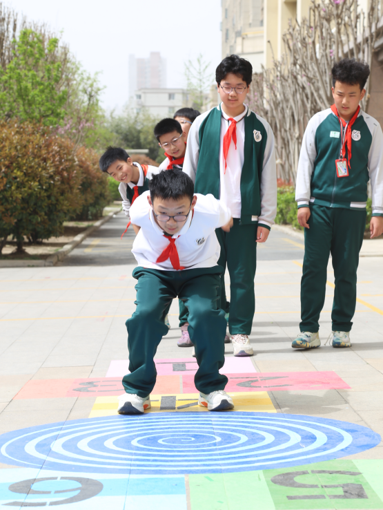 為了進(jìn)一步豐富學(xué)生的校園生活,在學(xué)生自選活動(dòng)項(xiàng)目中,學(xué)校最大限度的挖掘校內(nèi)活動(dòng)資源,根據(jù)學(xué)校的地面空間合理劃分游戲區(qū)域,為孩子們打造一個(gè)個(gè)別具特色的“地面游樂園”。以二十四節(jié)氣、傳統(tǒng)節(jié)日、數(shù)學(xué)計(jì)算、星系奧秘等主題設(shè)計(jì)的“蘿卜蹲”、跳房子等地面游戲,集健體、益智、趣味為一體,實(shí)現(xiàn)健身性與趣味性相融合。這些游戲極大地激發(fā)了學(xué)生的創(chuàng)新思維,讓他們在玩耍中玩出創(chuàng)意,營造出濃厚的校園文體活動(dòng)氛圍。讓每天下午的15分鐘課間活動(dòng)變得更加有序、有趣,使靜態(tài)的地面彩繪轉(zhuǎn)化為動(dòng)態(tài)的教育載體,讓冰冷的地面變成傳播知識、啟迪智慧、滋養(yǎng)心靈的生動(dòng)課堂。