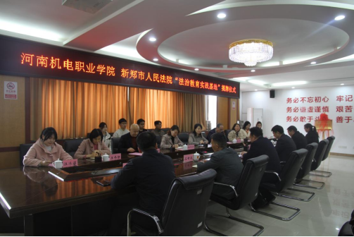 2025年3月28日,河南機電職業(yè)學(xué)院與新鄭市人民法院“法治教育實踐基地”揭牌儀式在新鄭市人民法院會議室舉行。新鄭市人民法院黨組書記、院長吳小鋒,黨組副書記、副院長楊廣印,黨組成員、政治部主任高魁,河南機電職業(yè)學(xué)院副校長谷獻(xiàn)暉,黨政辦公室、馬克思主義學(xué)院以及法院相關(guān)庭室負(fù)責(zé)人和學(xué)校師生代表參加簽約儀式,會議由楊廣印主持。