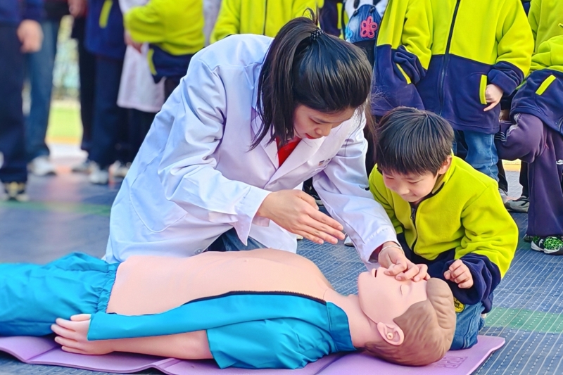活動當(dāng)天,志愿者們將心肺復(fù)蘇(CPR)技能轉(zhuǎn)化為趣味實(shí)踐。孩子們在指導(dǎo)下學(xué)習(xí)胸外按壓操作,志愿者通過“按壓頻率與《孤勇者》節(jié)奏同步”的比喻,幫助孩子們輕松掌握急救要領(lǐng)。7歲的童童第一次完成規(guī)范按壓后,興奮地拉著志愿者的手說:“我以后也要當(dāng)醫(yī)生!”現(xiàn)場還創(chuàng)新編排了“海姆立克急救法手勢舞”,將急救步驟融入《把未來點(diǎn)亮》的旋律中,孩子們通過肢體語言加深對急救知識的記憶。