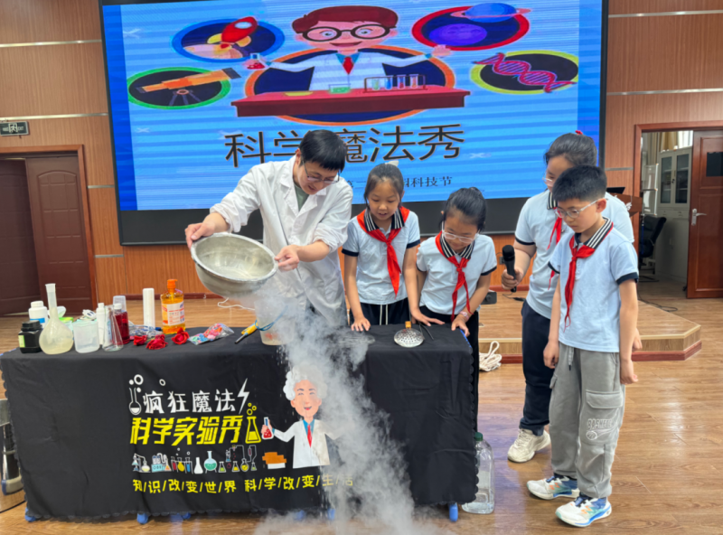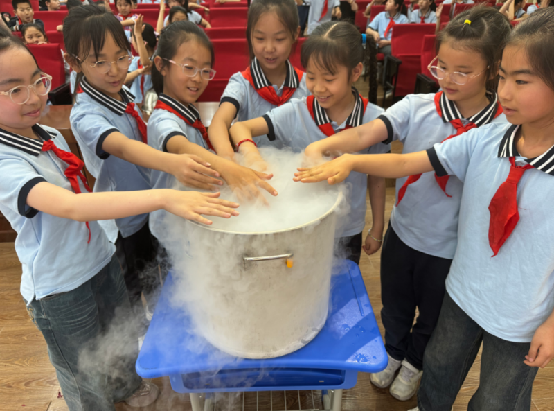 在“魔法秀”環(huán)節(jié),同學們仿佛踏入了一座小型科技館。只見“空氣大炮”鼓足腮幫子,“呼”地一下噴吐出強勁氣流 ;“神奇液氮”好似神秘的云霧使者,悠悠地釋放出如夢似幻的煙霧;“火焰掌”威風凜凜,熊熊烈火在掌間肆意跳躍 ;“馬德堡半球”霸氣登場,以不容置疑的力量展示大氣壓強的震撼 ;“大象牙膏”像被施了魔法,瘋狂生長、膨脹 ;“阿拉丁神燈”也不甘示弱,蓄積力量迸發(fā)出奇妙煙霧效果。一系列超乎想象的互動實驗,瞬間點燃了同學們內(nèi)心的熱情,大家再也按捺不住激動的心情,紛紛踴躍參與其中 。
