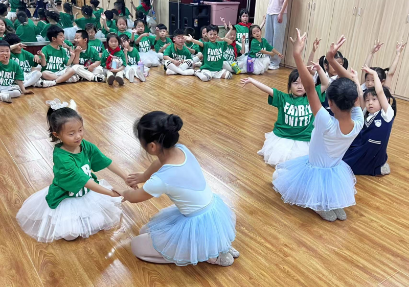 大課間活動中,幼兒隨著音樂,與哥哥姐姐一起舞動起來,在操場上開啟了童心的大門。