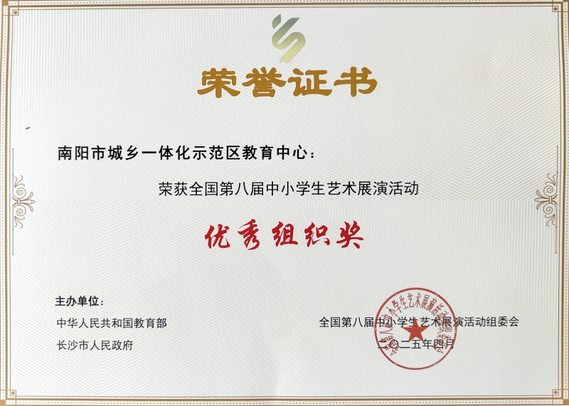 近日,在全國第八屆中小學(xué)生藝術(shù)展演活動中,南陽市城鄉(xiāng)一體化示范區(qū)教育中心報送的12件作品被遴選至全國第八屆中小學(xué)生藝術(shù)展演活動組委會,南陽市城鄉(xiāng)一體化示范區(qū)教育中心因此被評為優(yōu)秀組織獎。據(jù)悉,展演活動由教育部、長沙市人民政府共同主辦,于4月25日至27日在長沙舉行。
