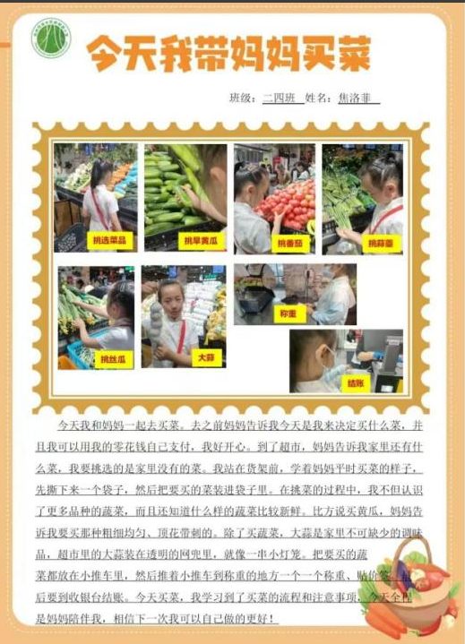孩子們通過自主買菜的過程不僅是增近了親子關系,更是在這一過程中體會到了每天可口飯菜背后的勞動與不易。學習如何挑選每樣食物拓展了孩子們的生活技能,自主買菜結賬鍛煉了孩子們的表達與交流,每一筆的消費也讓孩子們對錢的使用有了具體的概念。