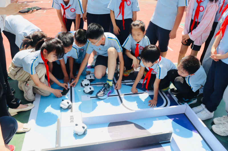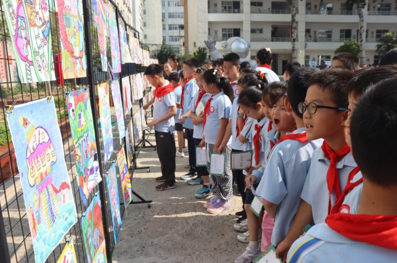學(xué)校為學(xué)生打造真實(shí)的科技探索場景,校園已然化作充滿奇思妙想的科技海洋。創(chuàng)想科幻畫展示了學(xué)生用畫筆勾勒出的科技空間;主題科技作品展示,低年級的“機(jī)械樂園”童趣盎然,中高年級“未來之家”“攬?zhí)煅埠!睔鈩莼趾?,每一件作品都凝聚著學(xué)生的智慧與汗水。同時,操場上人形機(jī)器人靈動起舞、VR設(shè)備帶領(lǐng)同學(xué)們“穿越”奇幻世界、四足機(jī)器狗穿梭人群……沉浸式的科技體驗(yàn)喚醒了學(xué)生對科學(xué)的追求。同學(xué)們手持打卡手冊,有序進(jìn)行各個展區(qū)的學(xué)習(xí)體驗(yàn),親手觸摸科技,用心感受創(chuàng)新,在打卡手冊上鄭重寫下對科技的熱愛,讓科技創(chuàng)新真正成為學(xué)生成長的底色。