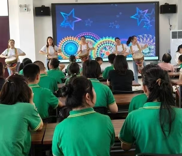 活動現(xiàn)場,志愿者們?yōu)楹⒆觽儙砭实奈乃嚤硌?。非洲鼓《麗江三步曲》富有激情,故事表演《三只小豬蓋房子》《長大以后做什么》聲情并茂,孩子們不知不覺沉浸其中。