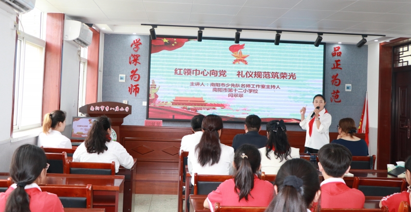 河南省紅領(lǐng)巾巡講團成員、南陽市少先隊名師工作室主持人閆翠翠對少先隊標志標識和禮儀進行了詳細講解。