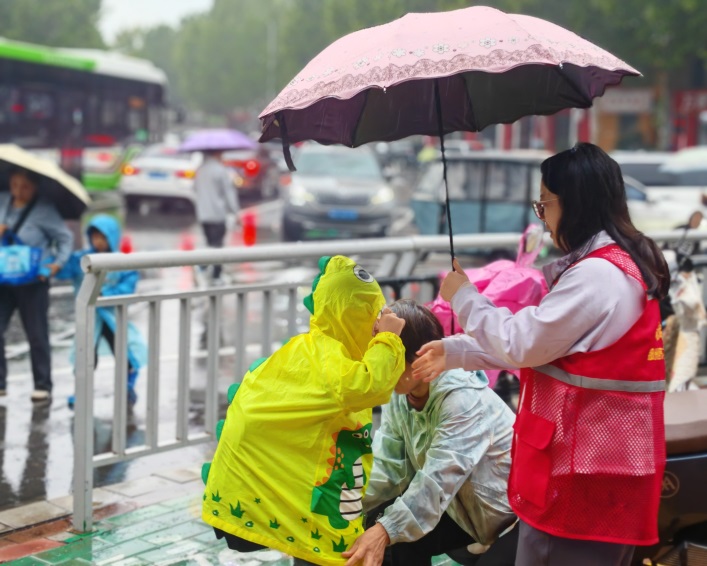 清晨的一場(chǎng)雨,讓校門口的“護(hù)學(xué)崗”顯得格外忙碌。身著志愿者服裝的家長(zhǎng)們?cè)缫丫臀?,有的為孩子撐傘,護(hù)送他們穿過雨幕;有的在道路旁引導(dǎo)車輛,確保通道暢通;還有的細(xì)心提醒奔跑的孩子注意腳下安全……這些看似平凡的舉動(dòng),共同構(gòu)成了“鳳翼護(hù)學(xué)崗”最動(dòng)人的畫面。