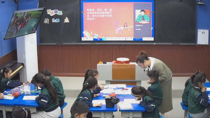 創(chuàng)作時刻,《森林狂想曲》的韻律在教室流淌,兩所學(xué)校的孩子們用點、線、面編織著心中的音畫交響。分享環(huán)節(jié),韋老師分別邀請兩校學(xué)生介紹“畫的是什么聲音”“用了哪些線條色彩”“為什么這樣畫”,強(qiáng)化了表達(dá)與審美交流。