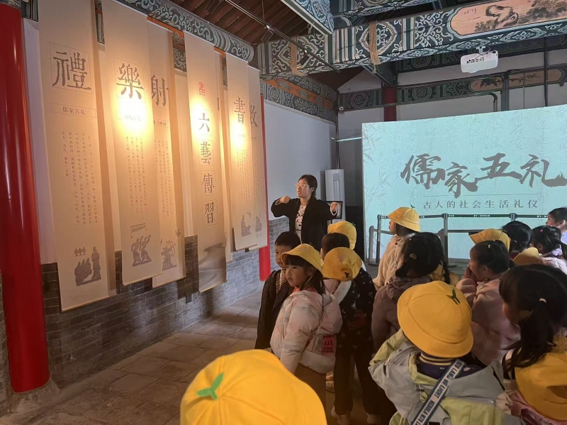 下午,大班幼兒繼續(xù)走進(jìn)鄭州文廟。教師在莊重典雅的大成殿前,為孩子們講解文廟的歷史地位——全國第二古老的孔廟。通過對歇山屋頂、琉璃瓦飾、龍鳳彩塑與“八仙過?!薄叭龂鴳蚯钡葢音~雕飾的觀察,孩子們不僅認(rèn)識了傳統(tǒng)建筑的審美特征,也初步理解了孔子倡導(dǎo)的“君子六藝”與為學(xué)之道。