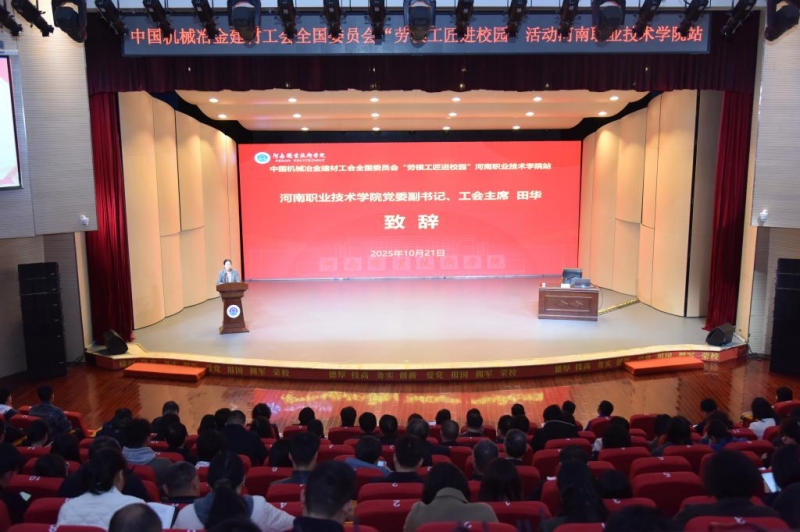10月21日下午,河南職業(yè)技術(shù)學(xué)院在音樂(lè)廳舉行“勞模工匠進(jìn)校園”暨“匠心大講堂”報(bào)告會(huì)。全國(guó)勞動(dòng)模范、中國(guó)一重集團(tuán)有限公司重型裝備事業(yè)部桂玉松,全國(guó)勞動(dòng)模范、方大特鋼科技股份有限公司甘榮剛應(yīng)邀作專(zhuān)題報(bào)告。中國(guó)機(jī)械冶金建材工會(huì)副主席張杰、冶金工作部部長(zhǎng)王欣,有色金屬工業(yè)人才中心主任助理趙麗霞,河南省機(jī)械冶金建材工會(huì)主席呂慶,河南省教科文衛(wèi)體工會(huì)二級(jí)調(diào)研員李陶營(yíng);校黨委副書(shū)記、工會(huì)主席田華,校黨委委員、副校長(zhǎng)朱永寬,學(xué)校相關(guān)單位師生代表參加報(bào)告會(huì)。