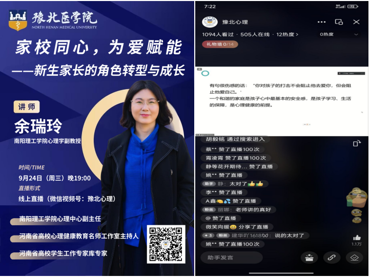 家校協(xié)同育人機(jī)制的完善,為學(xué)生成長構(gòu)建起堅(jiān)實(shí)后盾。9月22日,“家校攜手,同心護(hù)航”家長空中課堂開講,河南省高校心理健康教育名師工作室主持人余瑞玲副教授聚焦新生家長關(guān)切,圍繞親子分離調(diào)適、焦慮緩解等內(nèi)容提供專業(yè)指導(dǎo)。這場跨越時空的課堂,有效凝聚家校共識,幫助家長科學(xué)助力子女適應(yīng)大學(xué)階段,構(gòu)筑起牢固的家庭情感支持系統(tǒng)。