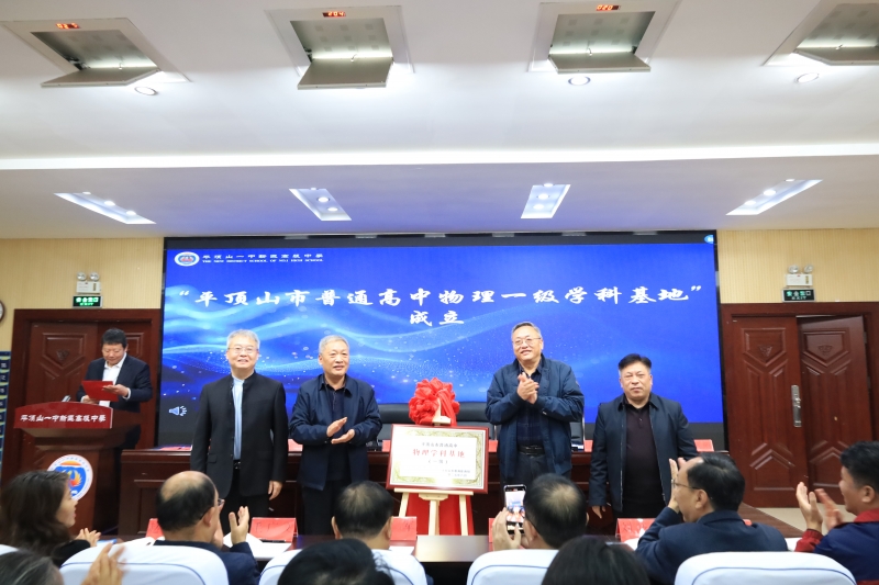 隨后,河南省基礎(chǔ)教育課程與教學(xué)發(fā)展中心原副主任丁武營、平頂山市教育和體育發(fā)展中心劉英明及司德平、關(guān)朝輝共同為“平頂山市高中物理一級(jí)學(xué)科基地”揭牌。