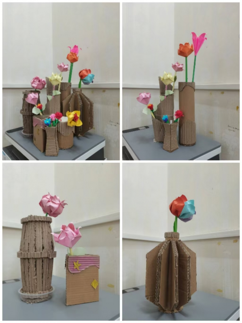 四年級(jí)學(xué)生進(jìn)行的是廢舊紙箱改造,同學(xué)們有的畫,有的裁,有的卷……一個(gè)個(gè)廢紙箱創(chuàng)意花瓶誕生了。這些花瓶質(zhì)樸的顏色,新奇的創(chuàng)意,配上紙折的花,給同學(xué)們帶來(lái)了無(wú)限驚喜。