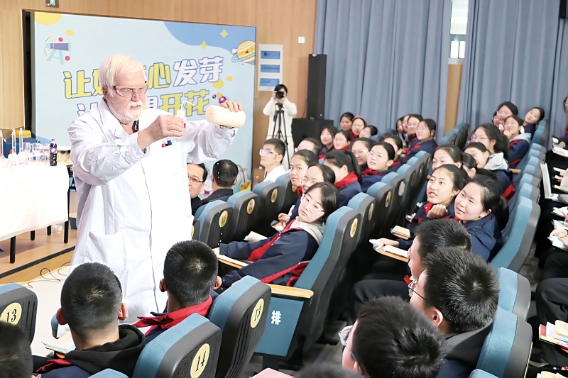 第一講中,被譽(yù)為“化學(xué)魔法師”的北京化工大學(xué)特聘教授、英國(guó)籍化學(xué)專家戴偉,將河南大學(xué)附屬中學(xué)的階梯教室變成了奇幻的化學(xué)樂(lè)園。