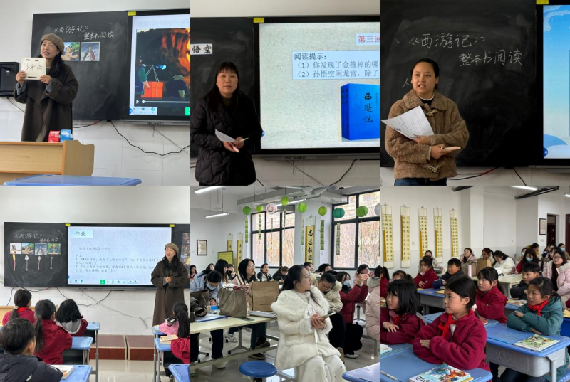 各班級(jí)圍繞不同主題展開深度研修。其中,一班在指導(dǎo)團(tuán)隊(duì)的帶領(lǐng)下,6位教師圍繞《西游記》進(jìn)行“整本書閱讀教學(xué)”課例展示,通過人物解讀、方法指導(dǎo)、情節(jié)梳理與主題升華等方面的細(xì)致演繹,系統(tǒng)呈現(xiàn)“整本書閱讀教學(xué)”的多元實(shí)施路徑。