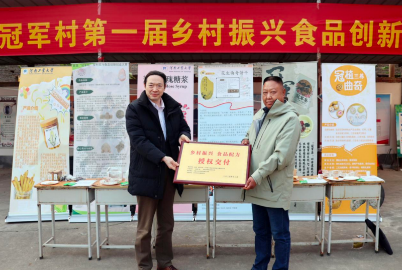 12月11日,在河南工業(yè)大學(xué)定點(diǎn)幫扶單位鄧州市張村鎮(zhèn)冠軍村的黨群服務(wù)中心院內(nèi),香氣四溢,掌聲不斷。首屆“冠軍村杯”鄉(xiāng)村振興食品創(chuàng)新大賽成果展示及移交儀式正火熱進(jìn)行,河南工業(yè)大學(xué)校長吳智深將為冠軍村量身定制的6個(gè)創(chuàng)新食品方案技術(shù)資料正式移交給冠軍村,從功能性食品到休閑食品,每一件作品都凝聚著高校智慧與鄉(xiāng)村需求的完美融合。