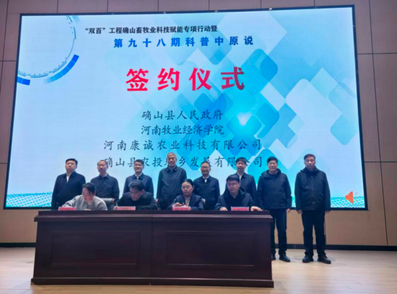 期間,河南牧業(yè)經(jīng)濟(jì)學(xué)院與確山縣政府、河南康誠(chéng)農(nóng)業(yè)科技有限公司、確山縣農(nóng)投城鄉(xiāng)發(fā)展有限公司現(xiàn)場(chǎng)簽訂合作協(xié)議;駐馬店市人力資源和社會(huì)保障局向“雙百”工程河南省服務(wù)基層專家團(tuán)團(tuán)長(zhǎng)、河南牧業(yè)經(jīng)濟(jì)學(xué)院社會(huì)服務(wù)辦公室主任胡華鋒授旗;確山縣政府向?qū)<覉F(tuán)11名成員頒發(fā)聘書。
