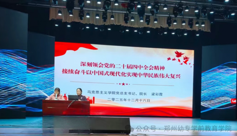 12月18日,鄭州幼兒師范高等??茖W(xué)校學(xué)前教育學(xué)院在新老校區(qū)同步舉辦黨的二十屆四中全會精神宣講報告會。報告會特邀學(xué)校馬克思主義學(xué)院黨總支書記、院長梁彩霞,馬克思主義學(xué)院教師薛曉輝、郝丹丹擔(dān)任主講,兩校區(qū)三場報告會,學(xué)前教育學(xué)院近2000名在校生聆聽,報告圍繞黨的二十屆四中全會精神展開系統(tǒng)闡釋,推動全會精神入腦、入心。報告會由學(xué)院總支書記唐靜主持。