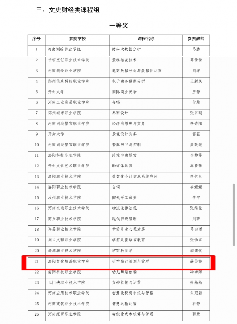 近日,河南省教育廳正式公示2025年河南省高等職業(yè)教育課堂教學創(chuàng)新大賽擬獲獎名單,洛陽文化旅游職業(yè)學院薛笑艷老師主講的《研學旅行策劃與管理》課程憑借鮮明的創(chuàng)新特色、扎實的教學功底和突出的實踐價值,在文史財經(jīng)類課程組激烈角逐中脫穎而出,成功斬獲一等獎!